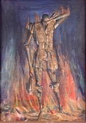 - This is an oil painting that shows Guy Montag hunched over in front of a fire of books.